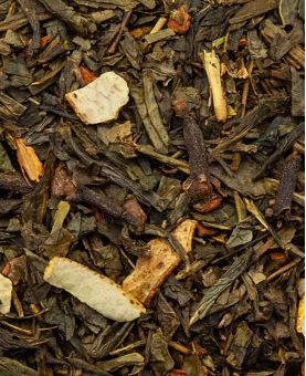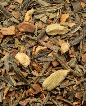 Thé vert sencha de Chine* et mélange indien traditionnel d'épices* cannelle*, gingembre*, clou de girofle*, poivre noir*, cardamome*.