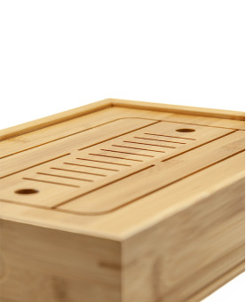 Cette table à thé ou bateau à thé est adapté pour la méthode d'infusion dite en Gong Fu Cha, préparation concentrée (parfois liquoreuse) de thé vert, wulong, rouge, sombre. Fabriqué en bambou vernis, elle ne nécessite qu'un entretien simple (rinçage à l'eau clair, séchage avec un chiffon doux). Son compartiment inférieur permet de récupérer l'eau de la première infusion et les pertes de thé lors des infusions en théière en terre cuite et petite tasse à couvercle nommée gaiwan.
