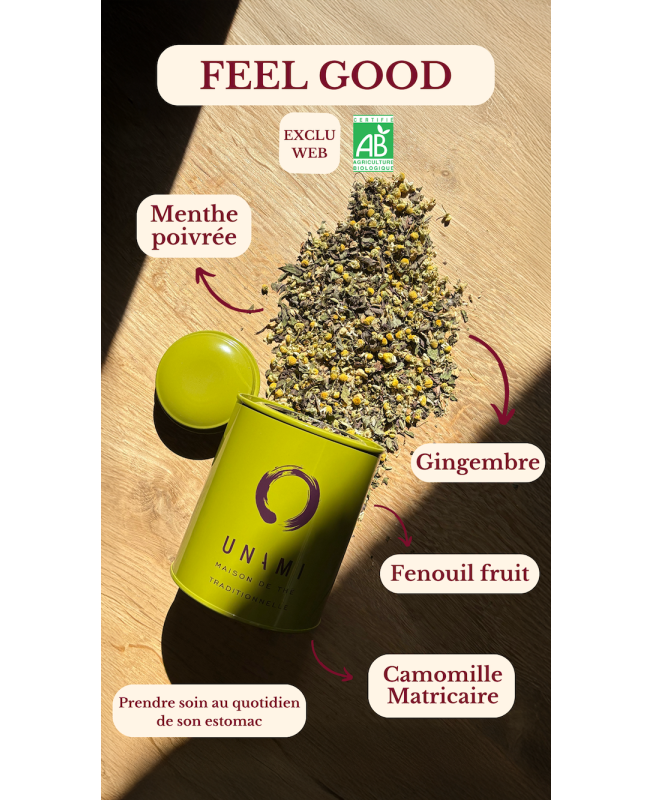 Menthe Poivrée* (UE origine FRANCE), Camomille Matricaire (UE)*, Fenouil fruit* (UE origine FRANCE), Gingembre* (non UE).