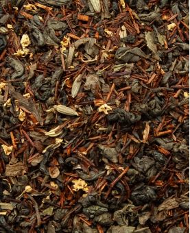 Thé vert Gundpowder*, gousses de vanille*, morceaux de rhubarbe*, pétales de souci*, arômes vanille et figue.