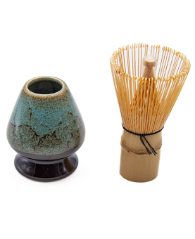Réunis dans un coffret cadeau, vous pourrez utiliser le bol céramique japonaise (chawan), doser avec la spatule (chasaku) en bambou, de battre ou fouetter la poudre de thé (matcha) avec le fouet en bambou (chassen) et après utilisation prendre soin de son fouet pour le garder longtemps en le faisant sécher sur sa forme le porte fouet.