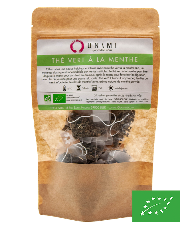 Offrez-vous une pause fraîcheur et intense avec notre thé vert à la menthe Bio, un mélange classique et indémodable aux vertus multiples.